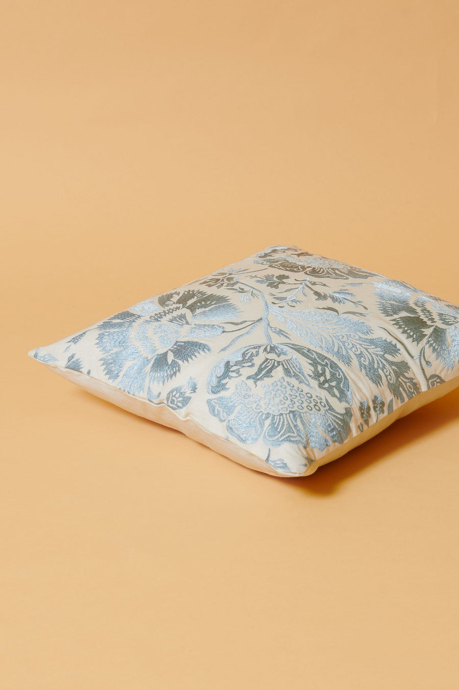 Featuring an intricate floral embroidery in shades of blue, this cushion will infused personality and florid flair into your interiors for decorative lushness.